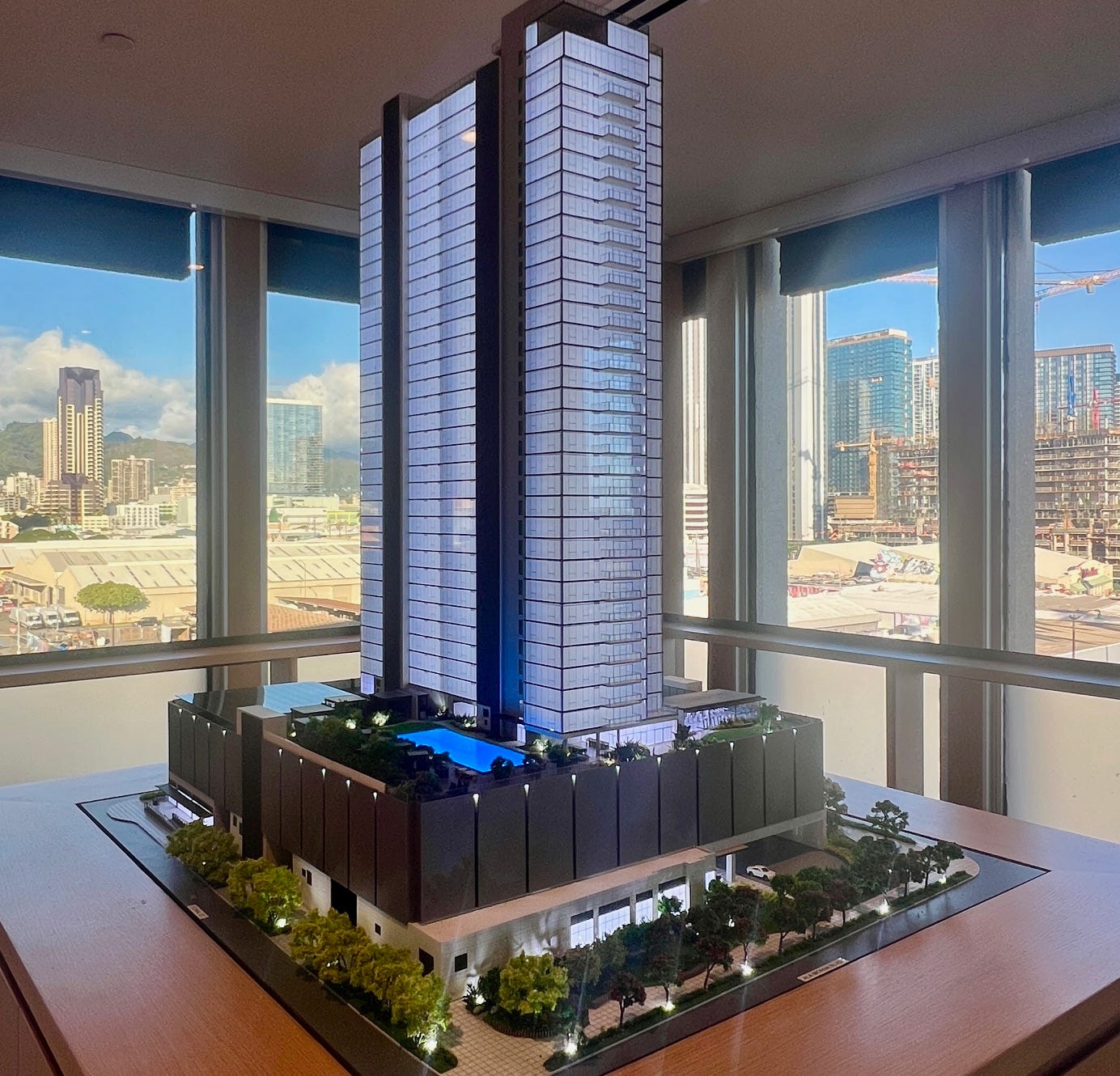 Kahuina will be one block mauka, at what will be a major retail hub at the intersection of Auahi and Cooke Streets. The two towers are being developed by Stanford Carr, and will have both “affordable” and market units. Applications are available now, with pricing and sales starting soon.